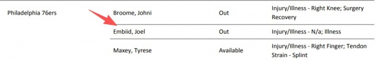 据赛前76人随队记者Ky Carlin报道,恩比德因伤病将缺席本场比赛。