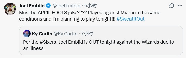 恩比德转发该记者报道,并吐槽道:“这肯定是愚人节玩笑吧???我在同样的条件下和迈阿密比过赛,而且我今晚还计划上场呢!!!”
